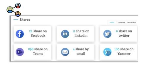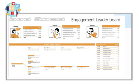 Understand how employees engage in your intranet with the engagement leader board. It will categorize your employees into three types of Intranet users: Observers, Amplifiers, and Engagers. The report is available as a Power BI pack that collects data from gamification.