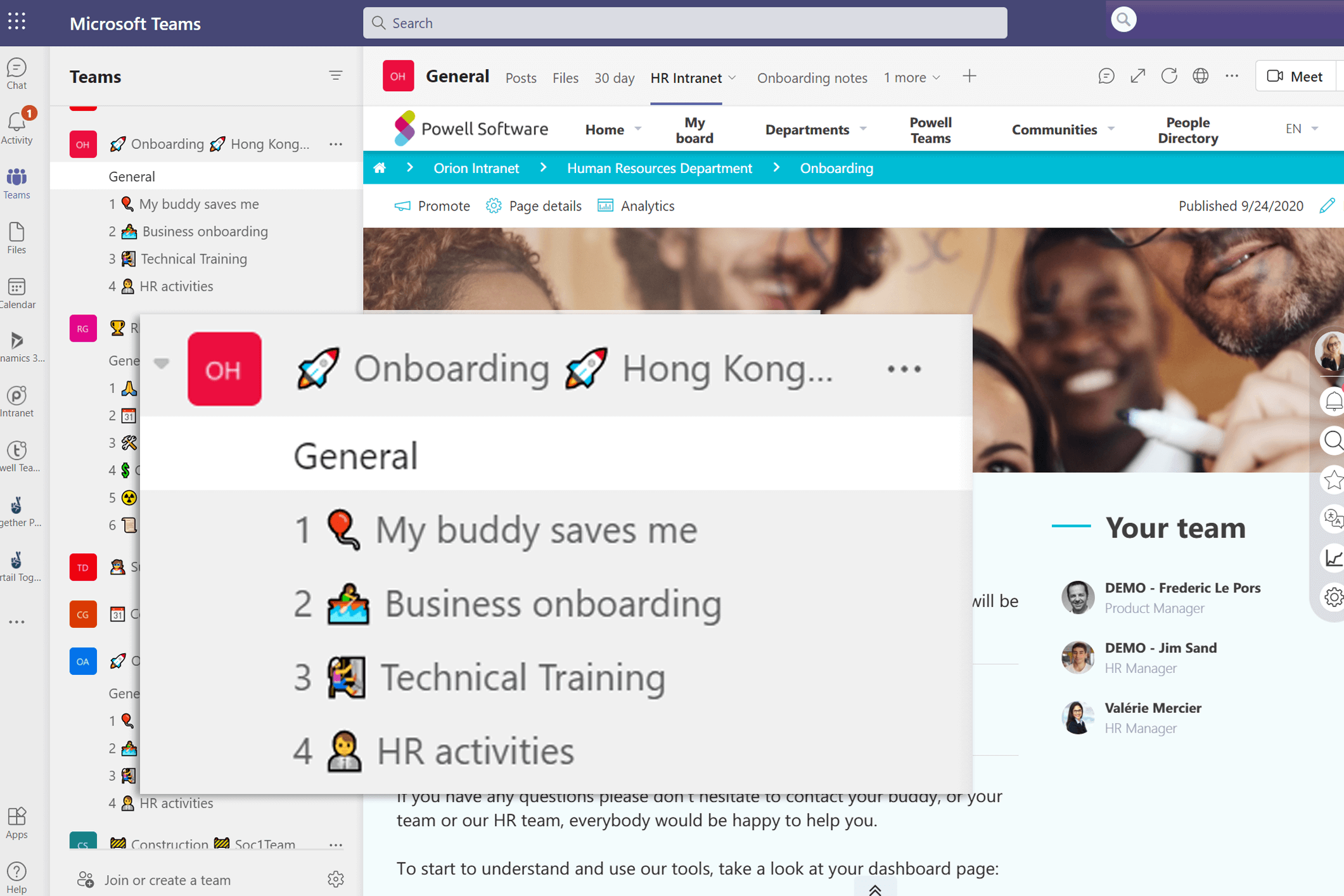 Powell Intranet is fully personalized and intelligently pushes targeted content for each department. When Powell Software templates are used, Frederic will find a dedicated HR space with an employee onboarding section. Here, he will have access to resources specific to his role and all of the corporate and top-down information.
