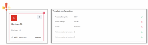 If a team fails to comply with any of the governance configurations in its template, a red info point will appear on the user dashboard. In the team editing interface, each governance rule displays an info point that indicates if the rule is being followed and why it’s important. This feature allows team owners to keep their teams in compliance with governance rules without the need for intervention from the Powell Governance administrator.