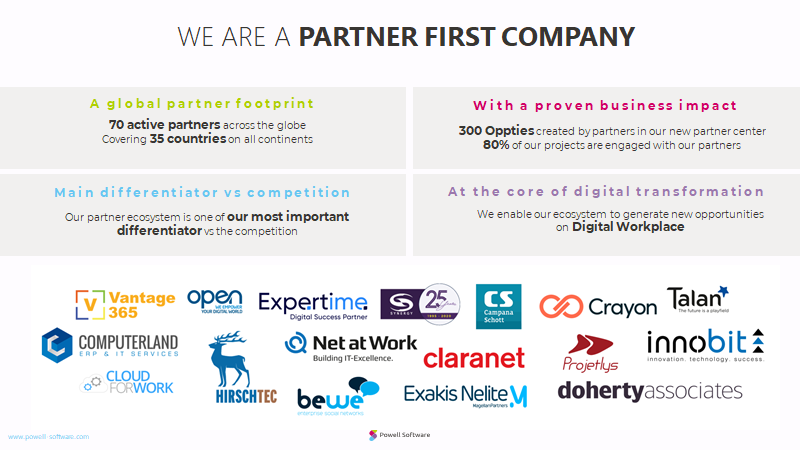 Heute können wir mit Stolz verkünden, dass wir über 450 Powell Software-Experten in unserem internationalen Partner-Ökosystem haben. Sie sind offiziell zertifiziert und bereit, die besten Lösungen von Powell Software zu liefern. Unsere Experten unterstützen Kunden beim Übergang zur “neuen Normalität”.