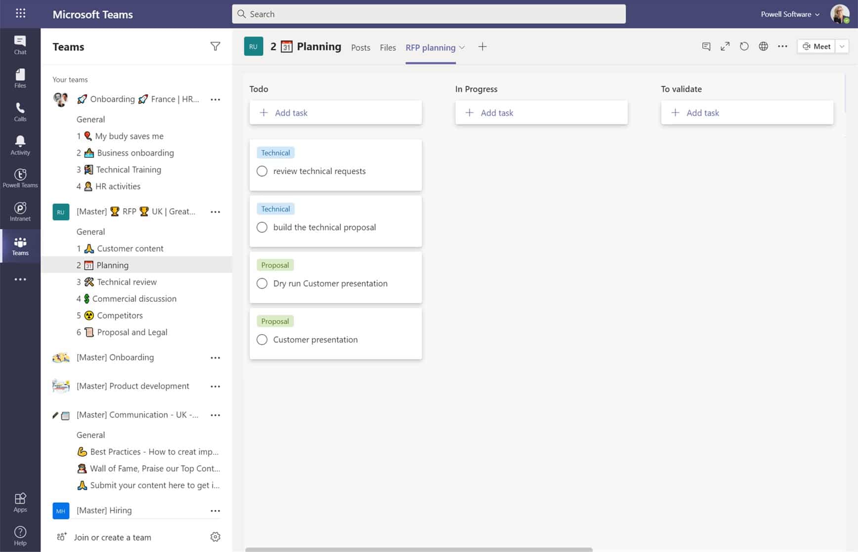 Sie verwendet die Sales RFP-Vorlage in Powell Teams, die sofort einen dedizierten Arbeitsbereich für ihre RFP erstellt. Er ist bereits mit Kanälen und Registerkarten sowie Geschäftsanwendungen vordefiniert. Sogar das Intranet ist bereits mit einer speziellen Marketing- und Vertriebsseite mit allen wichtigen Materialien integriert.