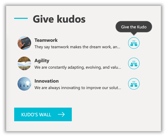 Die “Kudos” können überall auf Intranetseiten als Webpart angezeigt werden. Wir bieten jedoch auch die “Kudos-Wand” an – eine spezielle Kudo-Seite, auf der Intranet-Nutzer alle von Mitarbeitenden und Managern vergebenen und erhaltenen Kudos sehen können. Dies wird einen gesunden Wettbewerb und Engagement auslösen.