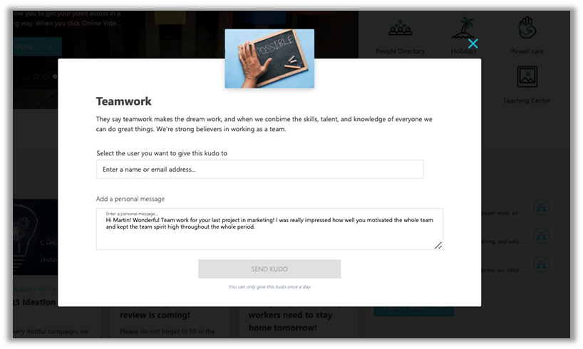 Die Funktion “Kudos” gehört zur Standardausstattung des Powell-Intranets und steht aktuellen und künftigen Kunden zur Verfügung. Sie ermöglicht es Mitarbeitenden und Managern, sich gegenseitig für ihre Leistungen zu loben und zu beglückwünschen, egal ob es sich um gute Teamarbeit, ein erfolgreiches Projekt oder eine andere Aktivität im Zusammenhang mit dem Unternehmensleben handelt. Die Leiter der digitalen Kommunikation oder der Personalabteilung legen die Themen fest, für die die Angestellten gelobt werden können. Die Benutzer können dann das “Kudos”-Thema auswählen und es an eine bestimmte Person senden.