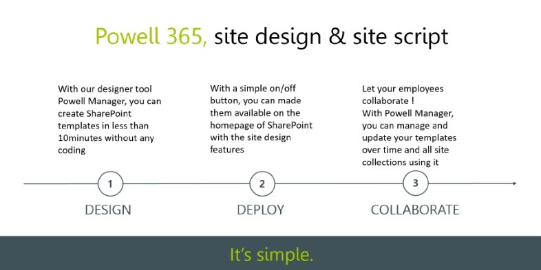 En résumé, la fonctionnalité Site Design est un réel changement dans la manière dont les utilisateurs finaux et aussi les équipes support utiliseront SharePoint. Powell Manager crée le design et met à jour les templates de sites, très facilement ! Il vous aide à tirer parti au mieux de cette nouvelle fonctionnalité SharePoint.