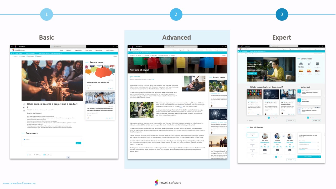 Powell Intranet offers a 3 leveled approach: Basic, Advanced, and Expert.