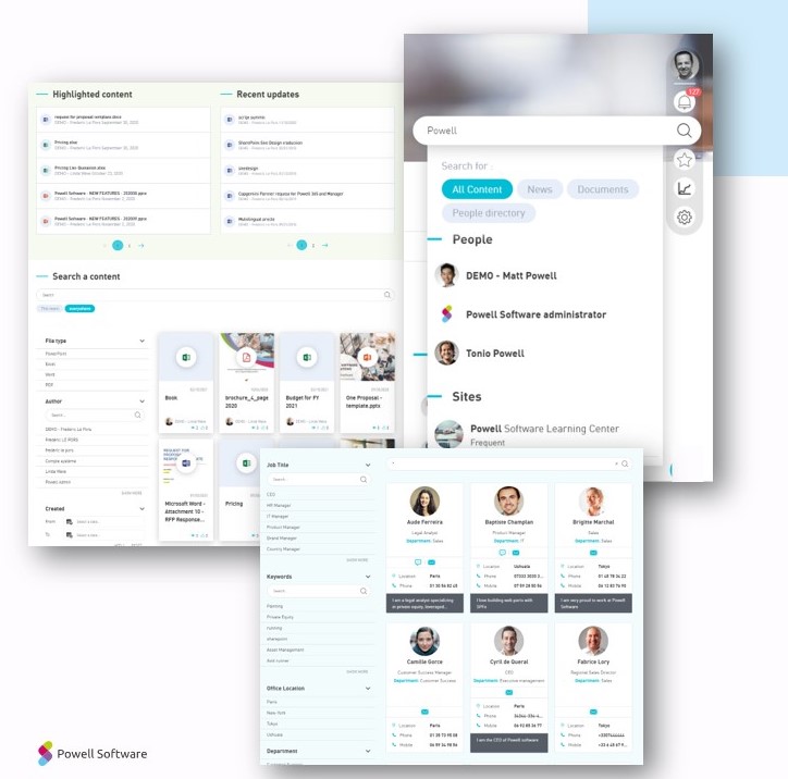 Powell Intranet includes an advanced search functionality based on SharePoint and Office 365 search. It provides search suggestions, refiners, and content previews.