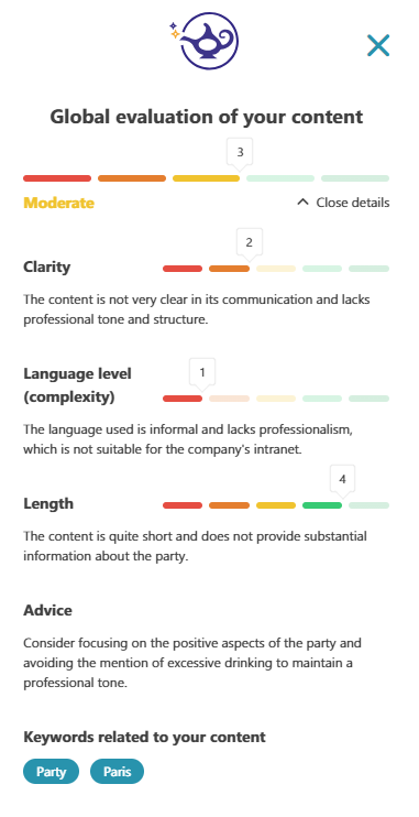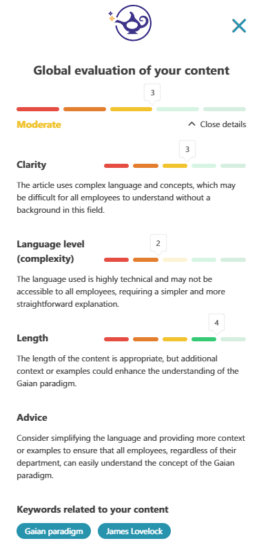 - Content enhancement: The assistant offers suggestions for improving the text, including simplifying complex language, optimizing length, and adjusting the tone to match the organization’s style guidelines. This is particularly useful for occasional contributors who may not be familiar with best practices in content creation.