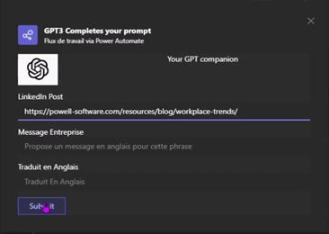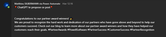 Among our Product and RD teams, some are already using ChatGPT’s integration with the Power Platform in testing: to question the bot from Microsoft Teams and ask it to help us employees write LinkedIn posts to share the latest Marketing articles.
