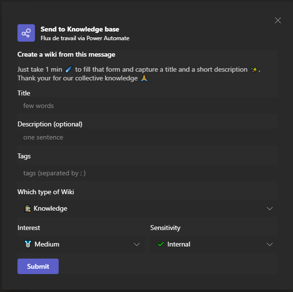 Il comprend un flux Power Automate pour aider les employés à collecter facilement les informations de messages spécifiques via un formulaire dans Teams. De nos jours, l’information se puise directement au cœur des équipes, c’est dans ces conversations entre collègues qu’il faut collecter les connaissances pour créer une intelligence collective.